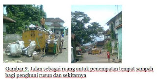 Sedangkan ada bagian jalan (sebelah selatan) Rumah susun terdapat gerobak sampah beserta penampungannya, tetapi sampah-sampah dari penghuni Rumah susun tersebut tidak sepenuhnya tertampung dengan baik di tempat sampah tersebut, yang mengakibatkan melubernya sampah di jalan, yang menimbulkan kesan kumuh dan tidak terawat.