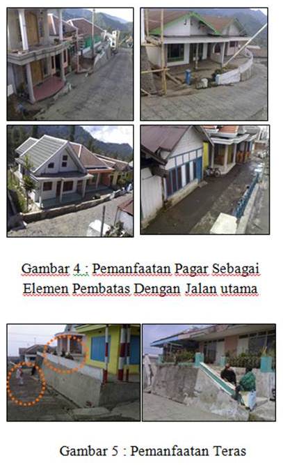 Bangunan yang berada pada lapis pertama memiliki teras rumah yang memberikan jarak antara ruang tamu dengan jalan utama desa. Kondisi awal teras yang ada tidak terdapat pagar pembatas dengan jalan utama dibentuk dengan batas bawah merupakan tanah tanpa adanya material penutup, serta tidak terdapat pembatas yang jelas antara teras hunian satu dengan yang lainya dalam satu deretan rumah yang terbentuk dengan adanya hubungan kekerabatan. Masyarakat menjunjung tinggi nilai kesetempatan yang dimiliki, akibat adanya anggapan bahwa masyarakat di Desa Ngadas merasa berasal dari nenek moyang yang sama. Pada perkembanganya, pagar pembatas jalan utama desa dengan teras rumah mulai dibangun oleh masyarakat di Desa Ngadas pada tahun 1993. Akses menuju desa-desa di sekitar Desa Ngadas mulai dibuka dengan melakukan pelebaran jalan serta memberikan fasilitas yang lebih baik. Jalur utama desa ngadas digunakan sebagai jalur utama kendaraan yang melintasi desa tersebut. Sehingga masyarakat mulai membuat pagar pembatas rumah dengan jalan utama desa. Penggunaan pagar lebih dikarenakan faktor kenyamanan dan keamanan penghuni bangunan yang berada di tepi jalan utama. Meskipun demikian pagar yang digunakan memiliki ketinggian maksimal 120 cm serta dibuat dari bahan dan bentuk yang tidak mengurangi optimalisasi jarak pandang bangunan dari lingkungan sekitarnya.