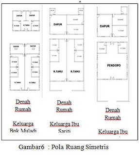 Pada hunian dengan latar belakang tanah atau pekarangan yang luas, ruang-ruang yang ada akan memiliki pola yang simetris serta dapur dibagian belakang letaknya terpisah dengan bangunan inti yang ada di bagian depan. Pola ini ditunjukan pada sampel keluarga milik Ibu marmi, milik Ibu sariti dan Bapak Muladi.