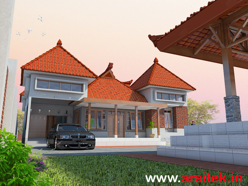 Fasad bangunan dibuat etnik vernakuler yaitu beratap perisa sesuai dengan kondisi desa dan masyarakat sekitar, ada pengeksposan batu bata merah, karena di daerah ini terdapat industri batu bata yang bagus dan berkualitas, sehingga bisa dijadikan sebagai ornamen pelengkap untuk hunian tersebut.